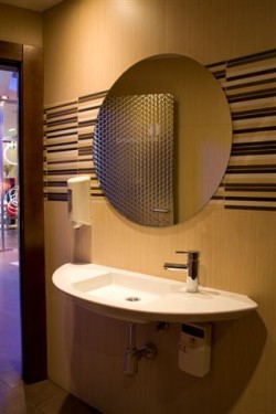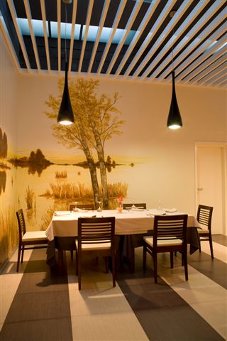 En la parte del fondo del local, se encuentra un comedor reservado en el que se ha mantenido una mínima iluminación natural cenital. En sus paredes un mural tipo «tranpantojo», pintado in situ por Susana Garay, una artista residente en Logroño y colaboradora del Estudio JF-interiorismo -responsables del diseño y dirección de obra de este local-