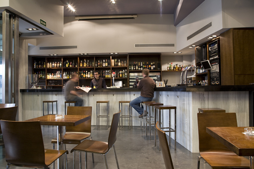 Una de las premisas del Proyecto, era atender el carácter polivalente de este negocio en cuanto a sus diferentes servicios y horarios. Por ello se planteó un ambiente bastante sobrio, pero cálido al mismo tiempo. Capaz de transformarse progresivamente a lo largo de las diferentes horas del día, mediante la iluminación artificial y natural, de manera que el ambiente resultara adecuado para cualquier momento: para el desayuno, el almuerzo, el aperitivo, el café de la tarde y las copas de la noche.
