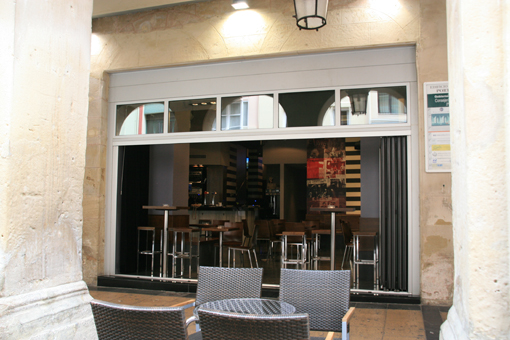 También era fundamental que se abriera a la calle, a la calle Portales nada más y nada menos, arteria principal del casco antiguo logroñés. Para ello se diseñó un cerramiento de aluminio, con puertas abatibles acristaladas transparentes. De esta manera la comunicación física y visual del interior del local con el exterior es directa, sencilla y natural. Uniéndose además con la terraza exterior del local, que por cierto se pone a tope a ciertas horas del día.