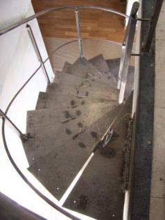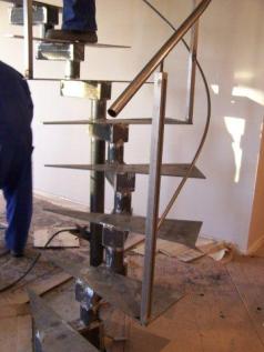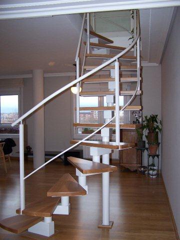 Un tema que ya he tocado en este blog, en un post de noviembre 2010 sobre una bonita escalera «imposible» de chapa plegada y trazado mixto (recto y curvo). Pero en esta ocasión, puedo decir que he tenido la satisfacción de codirigir el diseño y construcción de la escalera que podéis ver a continuación.